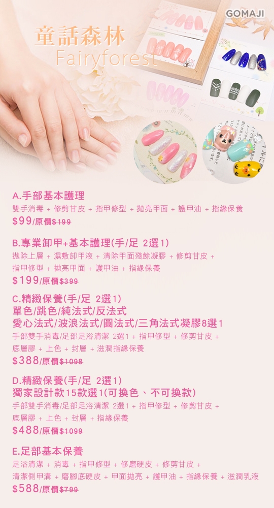 時下流行款式一次盡出,讓妳輕鬆挑選迷人時尚風格~【童話森林Fairyforest】細心溫柔的手法,打造美麗淨白指尖,還有獨家設計15款可選!